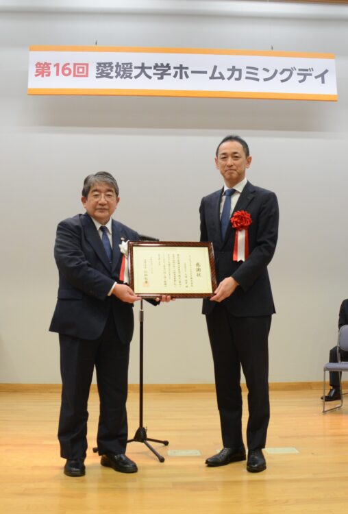 式典では、当社が地域貢献の一環として行った愛媛大学基金への寄付に対し、感謝状を贈呈いただきました。